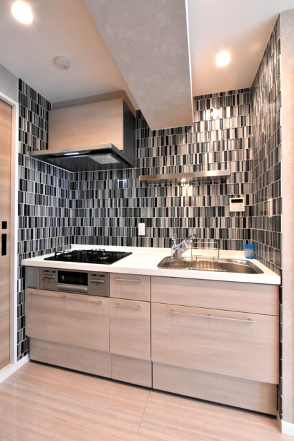 場所をとらずにお部屋を広く使えるキッチンです。デメリットはキッチン内が目立つこと。なるべく綺麗にしておくよう心掛けましょう!個性的なタイルが貼られお部屋全体の中でのアクセントにもなっています。