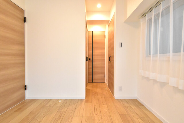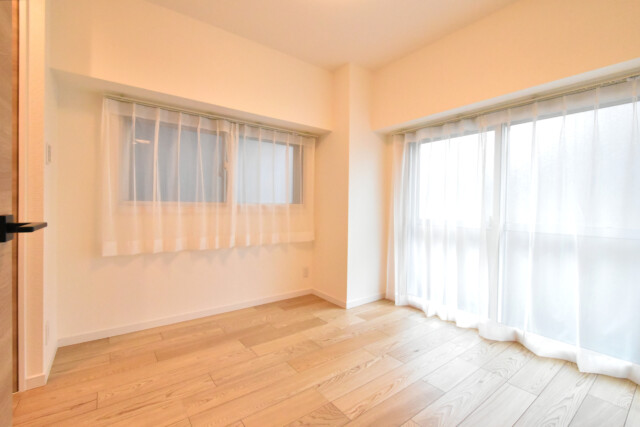 北西向きバルコニーに面した窓と南西向き窓がある二面採光のお部屋です。LDKとは違い白のクロスを使用したベーシックな内装なので、家具やカーテンなどのインテリアも幅広く選べそうですね。