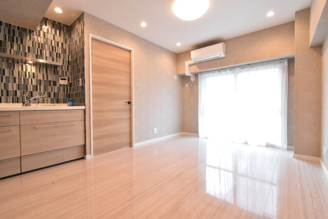 北西向きバルコニーに面したお部屋です。約9帖というと通常LDKとしてはギリギリの数字なんですが、こちらは意外と余裕がある感じ。キッチンを凹ませたりして、凸凹のない四角形のスペースを使えるようにしているのが功を奏しているようです。
