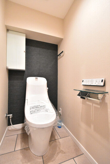 トイレはINAX製の洗浄機能一体型。トイレットペーパーのストックや掃除道具を入れておくのに便利な吊戸棚も付いています。出し入れのしやすい縦型なのが嬉しいですね。