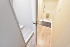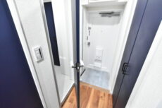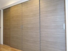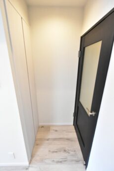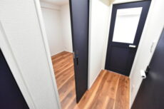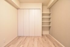 出入り口の正面の壁にはクローゼットとオープン収納が設置されています。