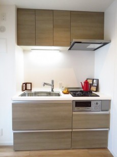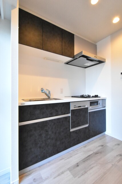 キッチンは壁付けタイプ。場所をとらずにお部屋を広く使えるのが特徴ですが、キッチン内が目立つので要注意です。食器洗浄乾燥機に洗い物をお任せすれば食後はのんびり過ごせますね♬