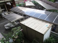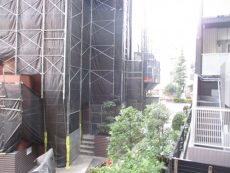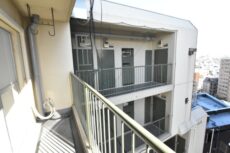 眺望です。左側は同マンションの共用廊下、右側はお隣のマンション。少し挟まれたような感じになっています。