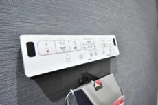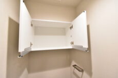 トイレはTOTO製の温水洗浄機能一体型。いろいろ飾ってインテリアを楽しめるニッチカウンターや、トイレットペーパーなどの収納に便利な吊り戸棚も付いています。