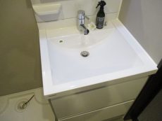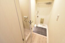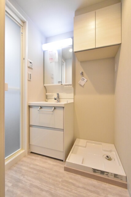 洗面室と洗濯機置場はお隣同士。白基調で清潔感たっぷり。