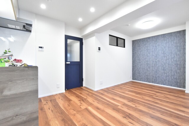 リビングダイニングの壁面には一部アクセントクロスが貼られていますよ!優しい色味でお部屋がとても素敵に見えます。