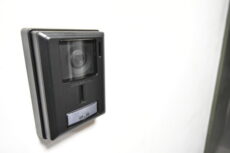 玄関前にきました。レトロな玄関ドア、この感じ、お好きな方も結構いらっしゃると思います。リノベーションされ、新たにモニター付インターホンが設置されています。室内にいながら来訪者の確認ができるので女性の一人暮らしでも防犯面で安心できます。