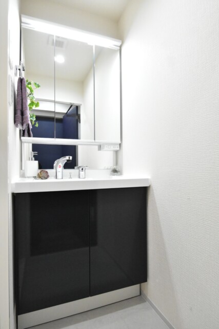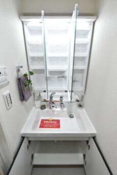 洗面室には洗面化粧台の他に洗濯機スペースと浴室がまとまっていて脱衣室も兼ねています。洗面化粧台は身だしなみを整えるのに便利な三面鏡付き。裏がキャビネットになっているので、洗面周りに散らかりがちな細々したものもスッキリと片付けることができますよ。