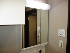 洗面台は新規です。鏡の下のタイルになっていて、鏡の渕が木調でオシャレを演出!
