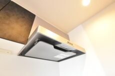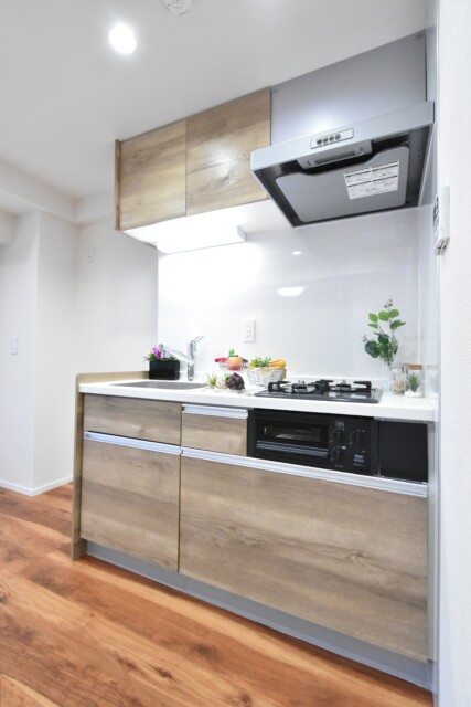 ガスコンロは2口、魚焼きグリル付です。レンジフードはシルバーで、キッチンの面材とマッチしています。