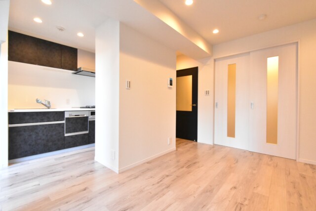 こちら側から見ると、黒のキッチンと扉がモダンな印象です。