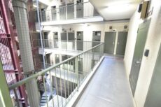 エレベーターで13階まで上がってきました。共用廊下は外廊下です。手摺が格子で通風抜群ですね。