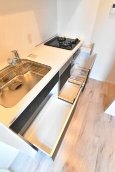 上下に収納があり大小様々な調理器具もたっぷりしまえます◎3つ口コンロで効率よくお料理を楽しんでいただけます。