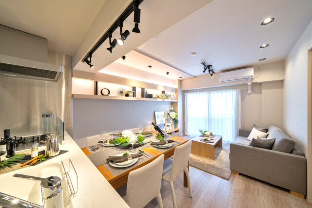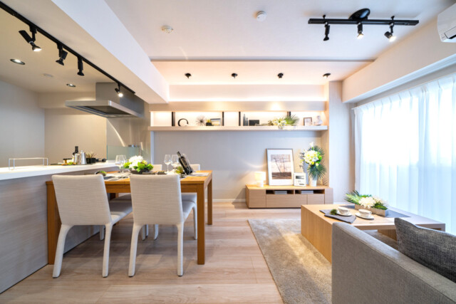 4人掛けのダイニングテーブルも問題なし。来客時はもちろん、普段二人で使うにしても多少余裕があった方がいいですからね。ちなみに家具は見本なので付いてはきませんが、飾ってくれると生活のイメージがしやすくて助かります。