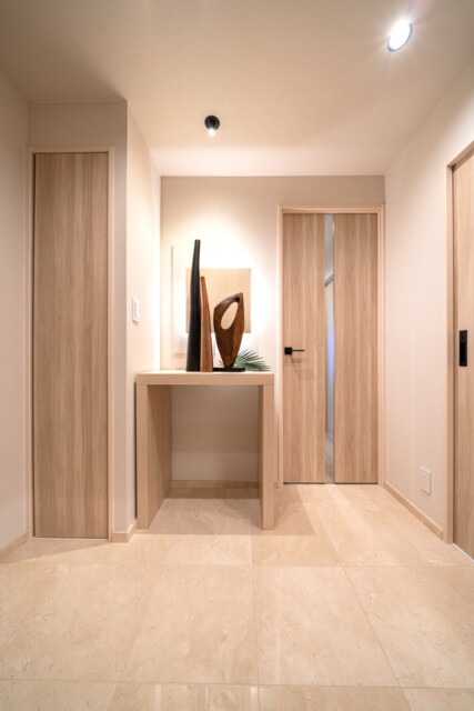 玄関を入ると細長い廊下ではなく、横に広いホールになっています。入って目の前がパッと開けてるって、なんだか特別な感じがしませんか?大理石貼りなのも高級感があって素敵ですね。正面に設置されたニッチカウンターはまず目がいくところ。センス良く飾り付けてお客様をお出迎えしましょう!