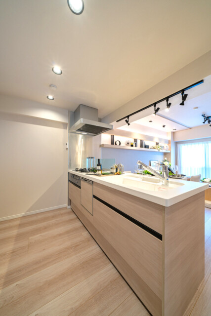 キッチンは開放的なカウンタータイプ。料理中でもリビングダイニングの様子がよく見えて、コミュニケーションもスムースです。人が集まった時でも、盛り上がっている声だけが聞こえるのは寂しいですよね(^-^;)食器洗浄乾燥機や浄水機能一体型水栓など便利機能も完備しています!