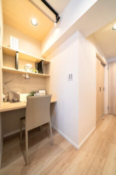 壁の凹みにデスクが造り付けられ「DEN」のようなスペースになっています。部屋になっている訳ではありませんが、ちょっと奥まっているので実際に座ってみると意外と集中出来そうですよ。
