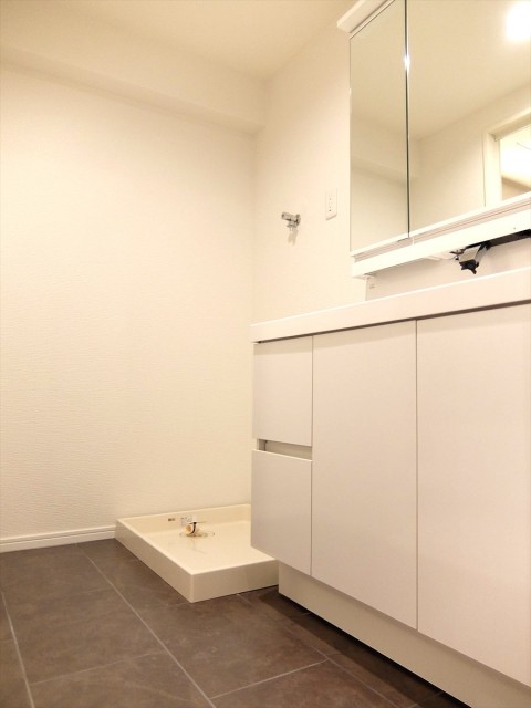 洗面室には洗面化粧台の他、洗濯機スペースと浴室がまとまっていて、脱衣所を兼ねているようです。洗面化粧台は三面鏡付。裏がキャビネットになっているので、洗面周りの細々としたものもスッキリ片付けることが出来ますよ。