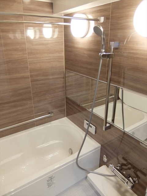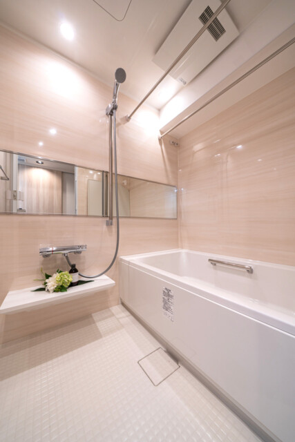浴室はベージュの木目パネルを使用。こちらは、建具、キッチン、トイレ、洗面、浴室に至るまで全てこのベージュで統一しているんですね!柔らかい雰囲気でとても癒されます(*^^*)浴室乾燥機能が付いているので、天気を気にせず洗濯機を回すことも出来ますよ。
