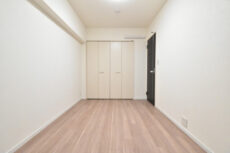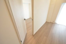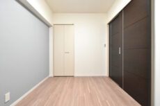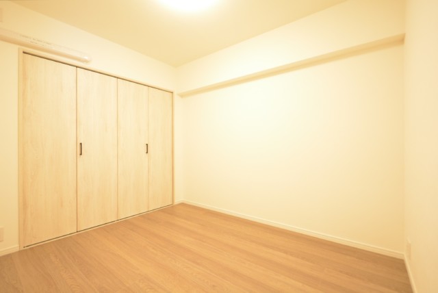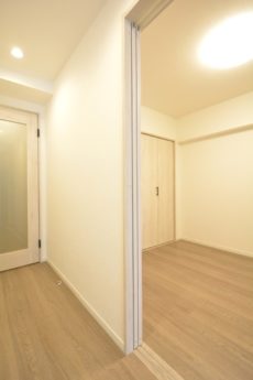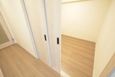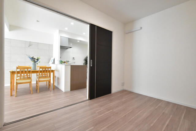 こちらは約4.7帖の洋室2。キッチン脇に位置する窓のないお部屋です。窓がないってマイナスに感じることが多いと思いますが、実は暗く静かで眠るにはピッタリなんですよ。仕切りが引き込み扉なので開放してLDKとつなげて使うことも可能です。