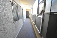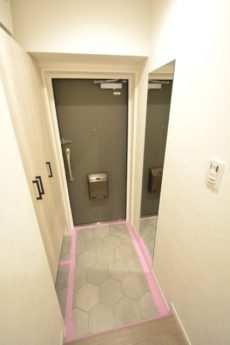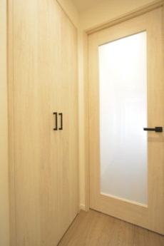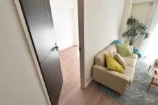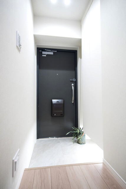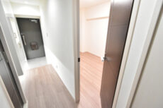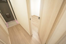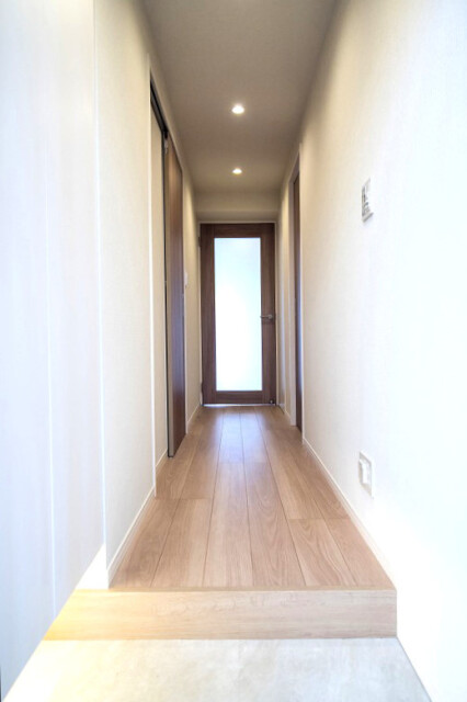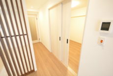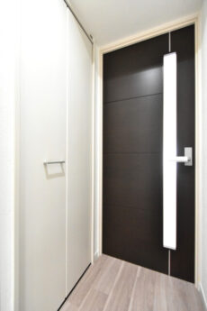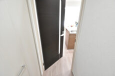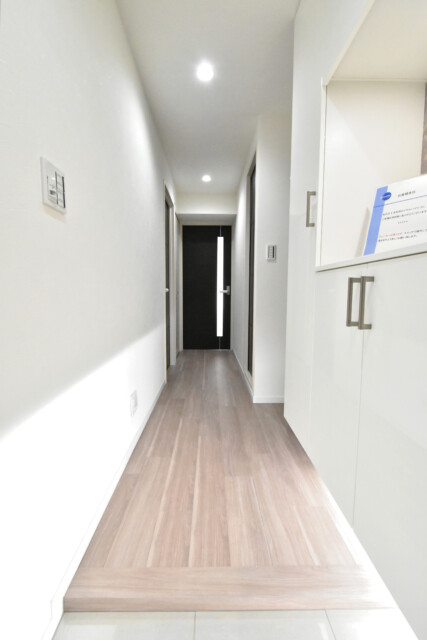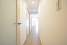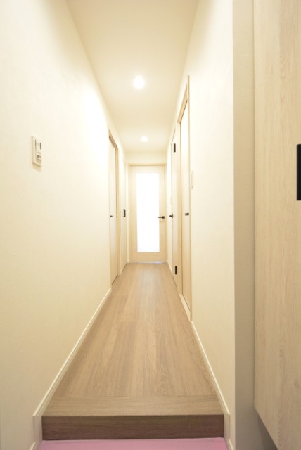 玄関から真っ直ぐ伸びた廊下は白を基調にした明るい雰囲気。濃いめのドアがアクセントになっていますね。リフォーム後ということでとても綺麗です。