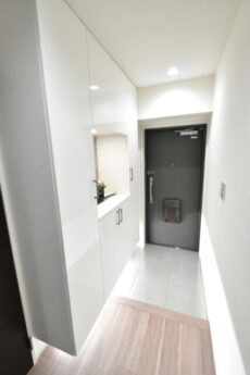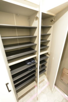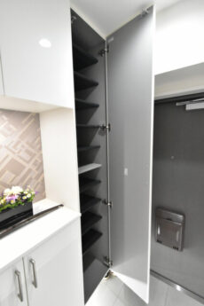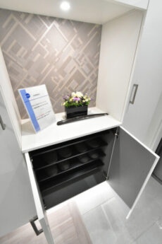 居室部分にスペースを使えるよう玄関はコンパクトに造られていますが、収納力のあるトールタイプのシューズボックスが設置されているので、靴が玄関に溢れたりする心配はなさそうです。棚の高さが変えられるのでヒールやブーツなどの背の高い靴だってきれいに収まりますよ。