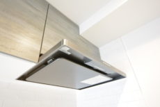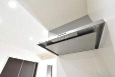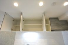 上部には吊戸棚と換気扇。料理の匂いって後から気になったりしますから、調理中は換気扇をお忘れなく!