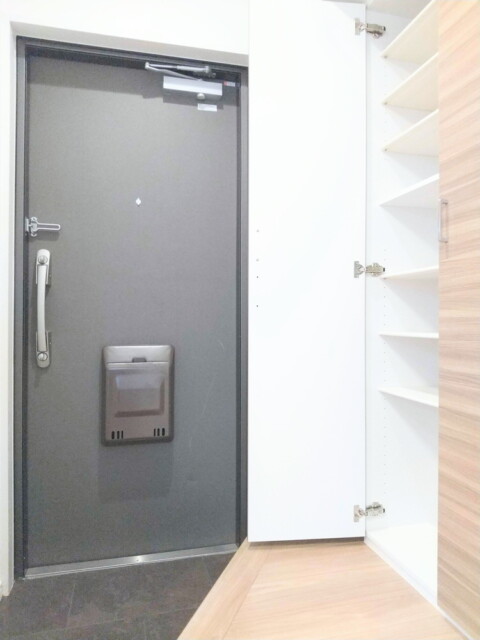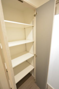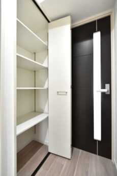 すぐの扉は収納棚。棚を調節すれば大きな物でも入りそうですね。逆に細かい物は、収納グッズなどを使うときれいに収まりますよ。