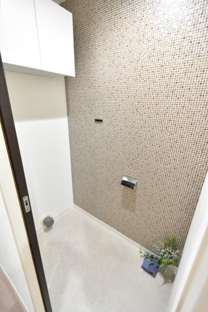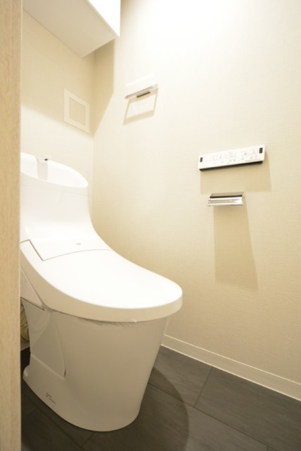トイレはINAX製の温水洗浄機能付き。トイレットペーパーや掃除道具の収納に便利な吊戸棚も付いています。