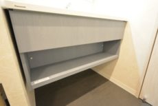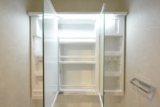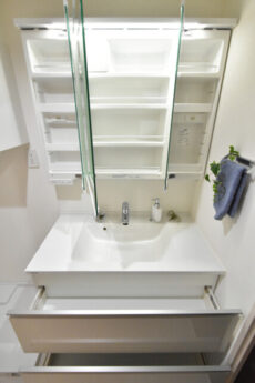 収納は洗面台下の棚と三面鏡裏のキャビネット。キャビネットは細かい物が多くなりがちな洗面周りにはピッタリの収納です。