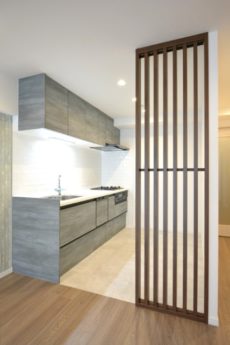 キッチンは壁付けですが、格子が設置されていて独立したキッチンの様な感じになっています。何もない状態ですとキッチン内が少し目立ちますが、多分前にダイニングテーブルがくるのでその点は問題ないと思いますよ。