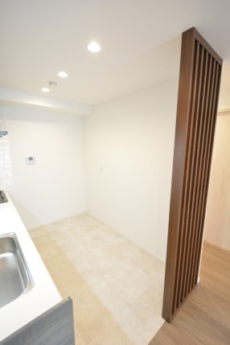 調理台後ろは冷蔵庫や家電ラックなどのスぺ―スになっていました。この向きだと本来なら丸見えになりますが、格子が目隠しになってくれるので問題ありませんね。