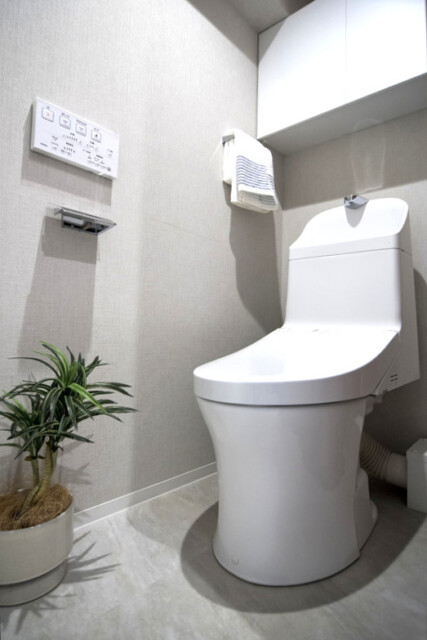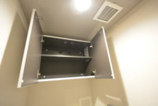 トイレは洗浄機能一体型。トイレットペーパーや掃除道具などの収納に便利な吊り戸棚も付いています。