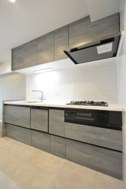 キッチンはリビングとの一体感が人気のカウンタータイプ。コンロ前にだけ壁が設置された開放感と使い勝手のバランスがとれたキッチンです。みんなの憧れ食器洗浄乾燥機付き!洗い物をお任せして食後はみんなでのんびりしちゃいましょう♬