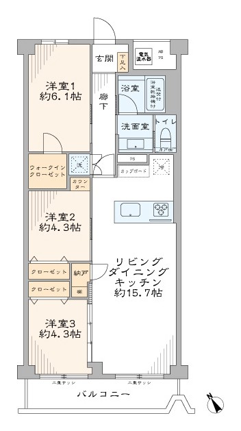また、バルコニー側の窓は二重サッシを採用しているため、気密性にも優れています。