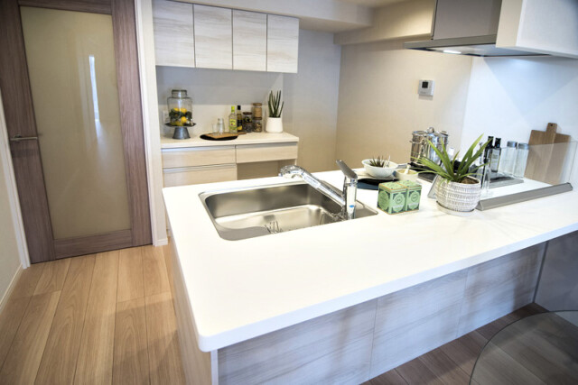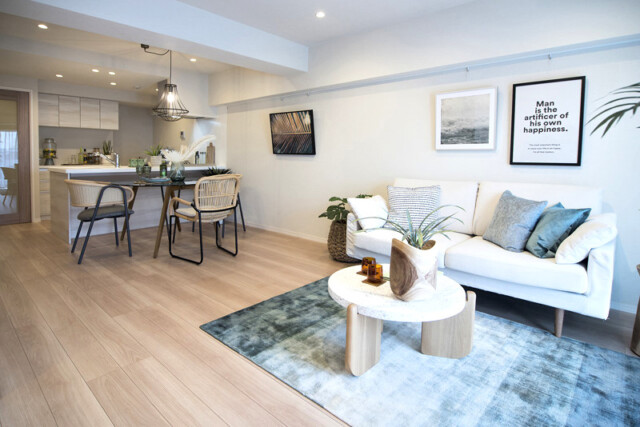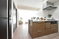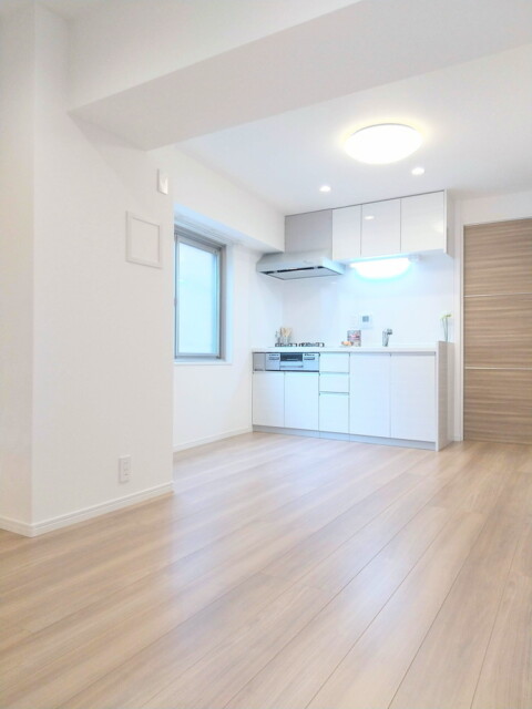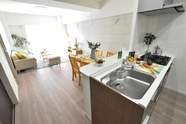 こちらは約15.3帖のリビング・ダイニング・キッチン。南西向きバルコニーに面した明るいお部屋です。木目と白のナチュラルな雰囲気で居心地が良さそうですね。色使いがシンプルなので家具も合わせやすそうです。