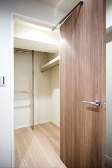 こちらは約6帖の洋室1。リビングに隣接したお部屋です。収納はウォークインクローゼット!L字型にハンガーパイプが付いた奥行きのある収納です。衣類以外にもかさばる物の収納に使えそうですね。洋室の中では一番広くメインの寝室にお勧めです。