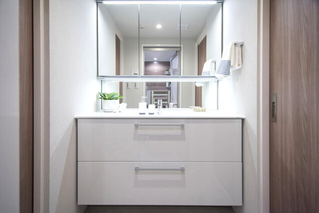 朝の身支度にも便利な三面鏡付き。TOTO製です。