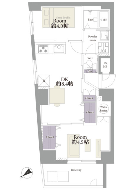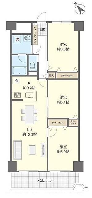 南西向きのバルコニーに面した明るいお部屋です。縦長なのででダイニング、リビングのゾーニングもしやすくなっています。