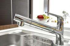 水栓は浄水機能付きシャワー水栓。L型形状で大きな鍋なども楽に洗えます。シンクを流す時はヘッドを伸ばして使いましょう。