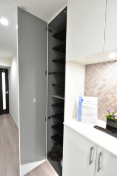 両サイドにトールタイプ、中央にはカウンターが付いています。カウンターは鍵などちょっとした物を置いたり、いろいろ飾ってインテリアを楽しんだりと、あると便利なスペースです。家の顔って言われていますから綺麗に飾ってあげたいですよね。上の吊戸棚はブレイカーが入っているのであまり物は入れない方がいいと思います。