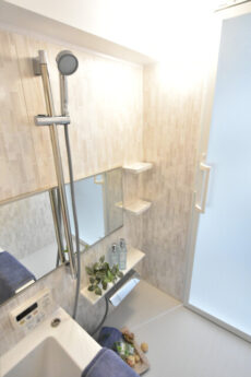浴室は温かみのある色のパネルに囲まれた優しい雰囲気でリラックスしたバスタイムを過ごせそう。追い焚き機能や浴室換気乾燥機などの便利機能も完備!これからの雨の多い季節、天気を気にせずに洗濯機をまわせるのは助かります。