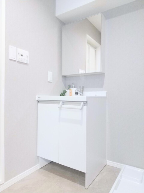 洗面室には洗面化粧台の他に洗濯機スペースと浴室がひとまとめになっています。洗面化粧台は身だしなみを整えるのに便利な三面鏡付き。裏がキャビネットになっているので洗面周りの細々したものもスッキリと片付けることができますよ。ランドリー用品は洗濯機スペース上の吊り戸棚へどうぞ。