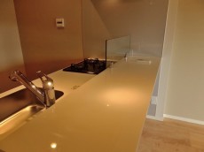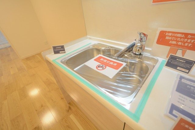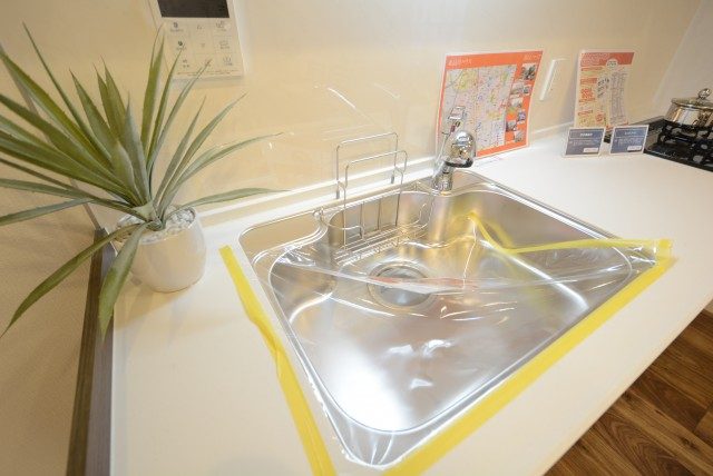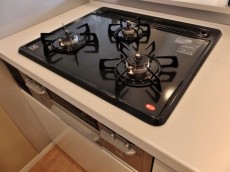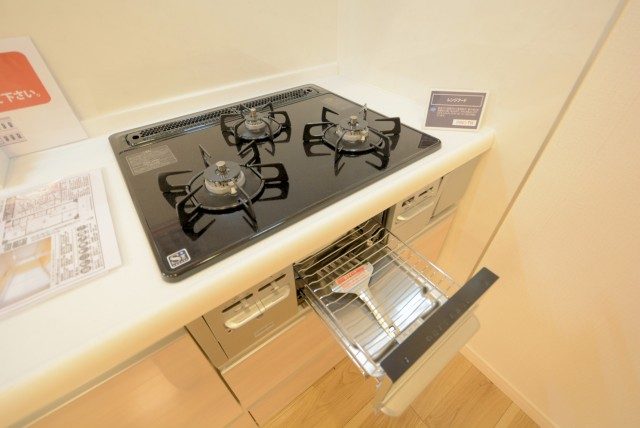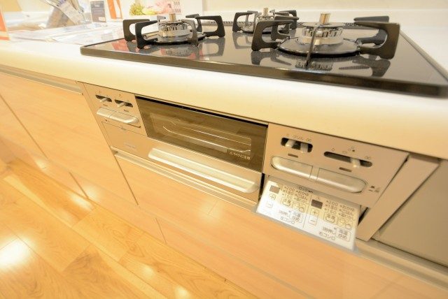 キッチンスペースは広めにとってあります。3口コンロや浄水器付水栓も完備!