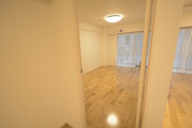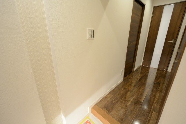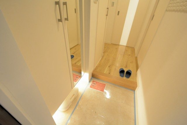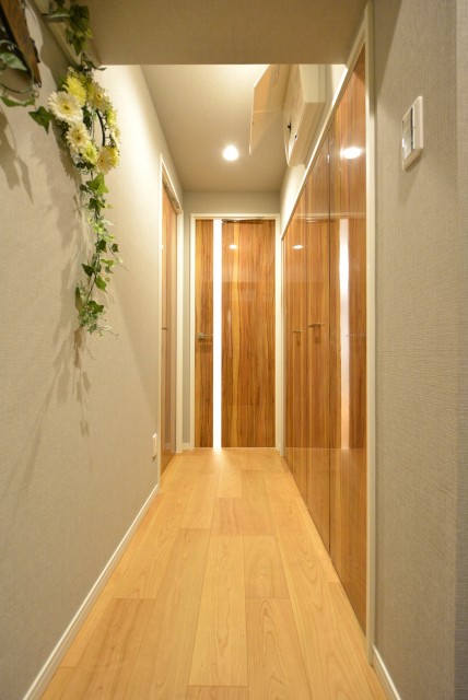 中に入ると廊下が伸びていました。建具は鏡面仕上げでピカピカ。ライトが映り込んでいて綺麗です。