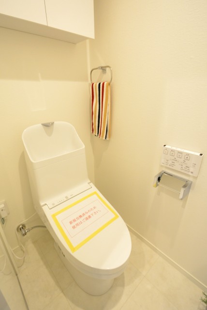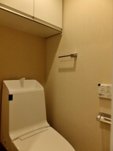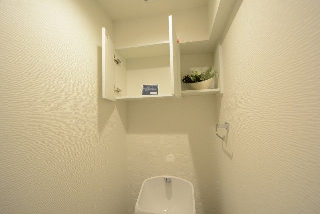 吊戸棚にはトイレットペーパーなどのストックを。TOTO製の「ウォシュレット」も付いています。