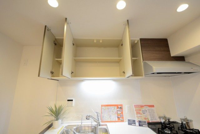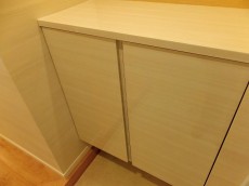 洗濯機スペースには上部に吊戸棚があり、洗剤などをまとめておく事が出来ます。少し低めに設置されているのが優しいですね(^^)