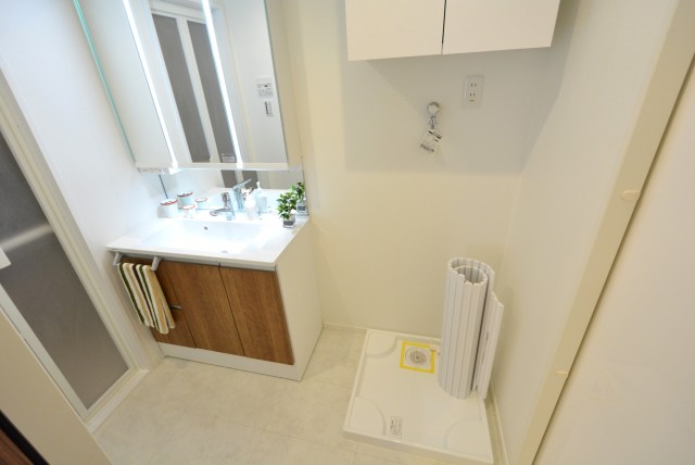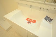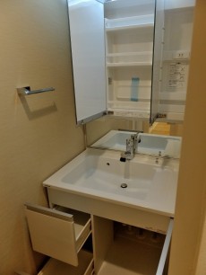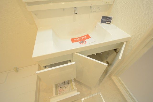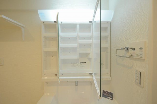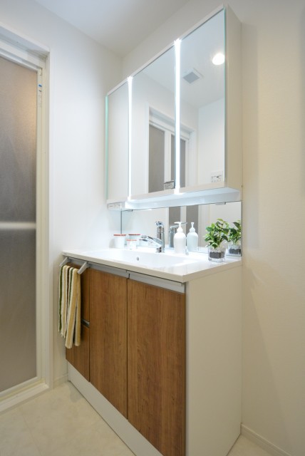 収納は洗面台下と鏡裏のキャビネット。細かい物が多くなりがちな洗面周りには、キャビネットが便利です。