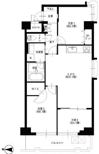 今回のお部屋は5階、間取りは3LDK、専有面積は67.90㎡、東南角部屋となっています。