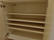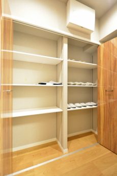 廊下の途中には収納棚がありました。スリッパが並んでいましたが、板の間隔からいって棚ですよね?
